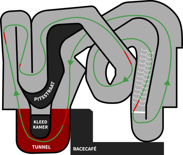 Denk aan de ideale lijn! De ideale lijn is de vloeiendste weg van start naar finish. Bij iedere kartbaan is de ideale lijn anders, hieronder zie je de ideale lijn van de Coronel kartbaan.